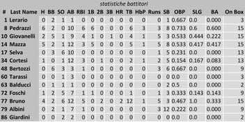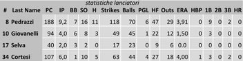 Questa la formazione partente dello Junior Rimini di Gara 4 6 Giovanelli 0/3, 2 Mazza 0/2 1bb, 1 Pedrazzi 2/2 1hbp, 3 Bruno 1/2 1hbp, 4 Selva 0/3, 8 Foschi 1/3, 7 Albini 0/3, 9 Bertozzi 3bb, 5 Giardini 0/1 (Cortesi 0/2) |